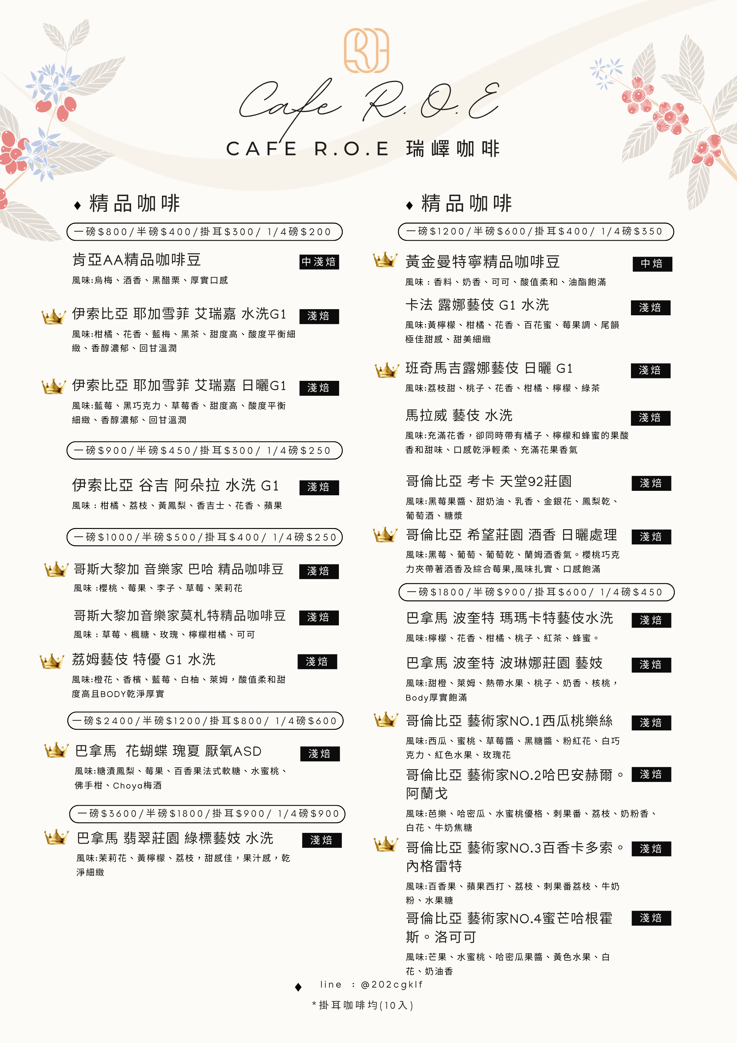 | 精品咖啡 | 風味 | 烘焙度 | 一磅 | 掛耳 | 1/4 | |