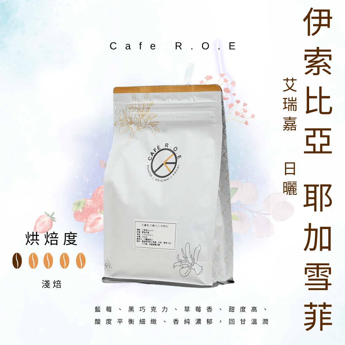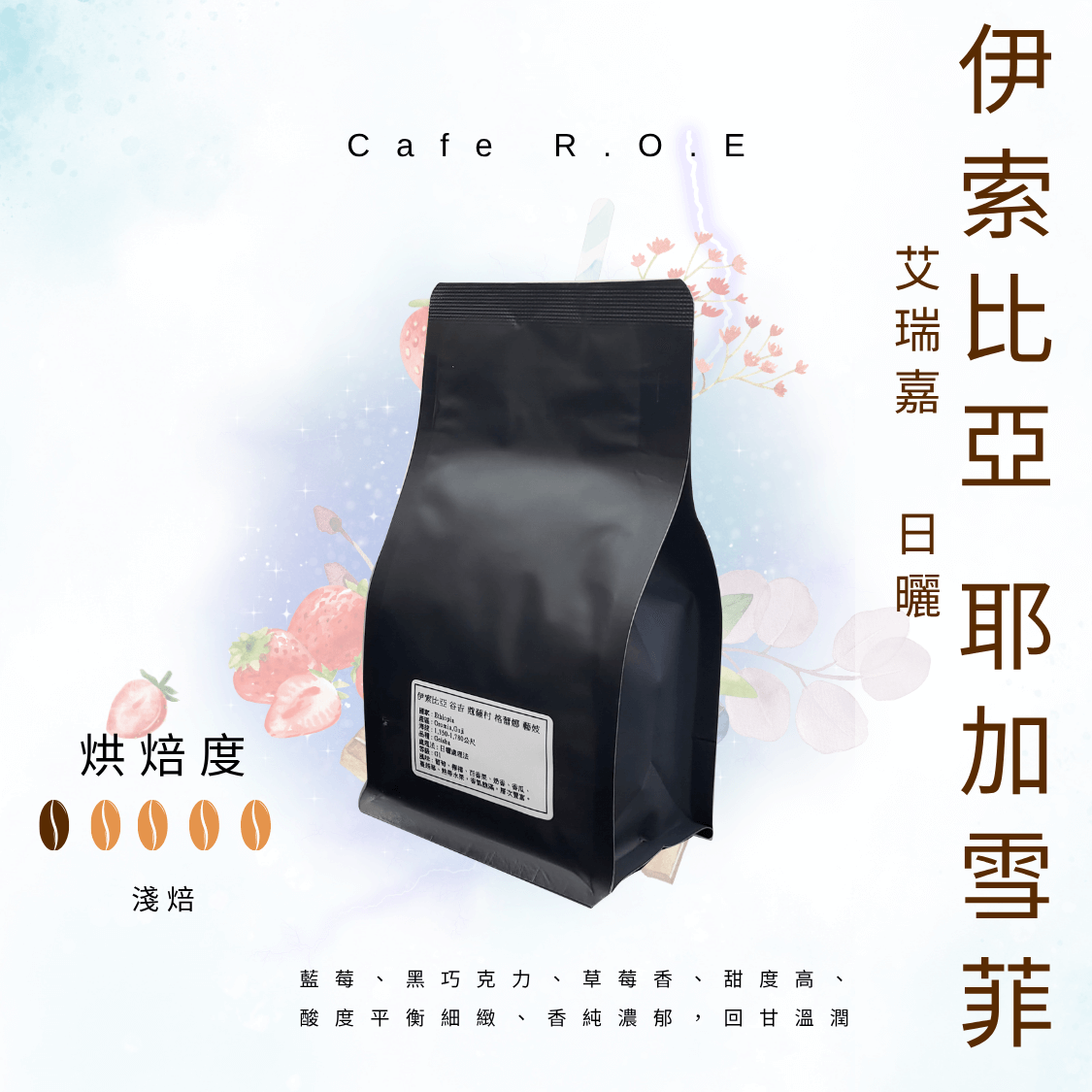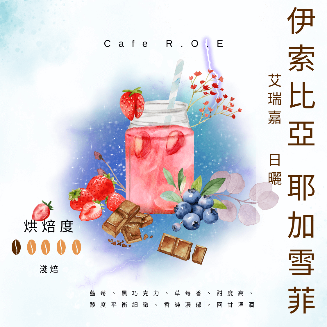 風味 : 藍莓、黑巧克力、草莓香、甜度高、酸度平衡細緻、香純濃郁,回甘溫潤